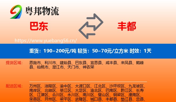 1、以上巴东县到丰都县运费仅为站到站报价(不含取货送货包装上楼等费用)仅作参考,准确报价请以粤邦物流官方客服实际报价单为准!