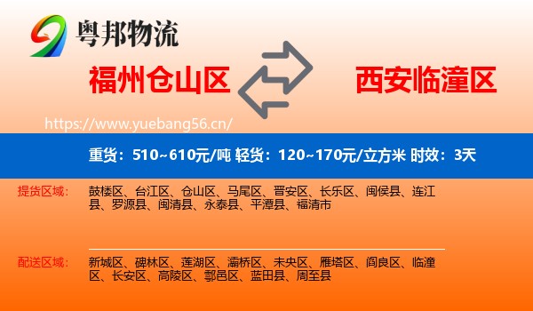 仓山区到临潼区物流公司专业运营从福建/福州/仓山区至陕西/西安/临潼区货物运输业务,经过多年的运营和发展,仓山区到临潼区物流专线已成为粤邦物流的优质品牌物流专线之一。福州仓山区到西安临潼区专线运营里程约1737.51公里,货物运输全程GPS定位,由太平洋保险全程保价运输,可提供“门到门”货运服务、天天发车,重货参考价:510~610元/吨、轻货参考价:120~170元/立方米运费价格根据实际货物类型上下浮动3%;预估时效:3~4天,运输时效和天气及交通状况因素略有差异。