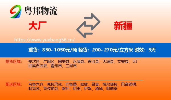 1、以上大厂回族自治县到新疆运费仅为站到站报价(不含取货送货包装上楼等费用)仅作参考,准确报价请以粤邦物流官方客服实际报价单为准!