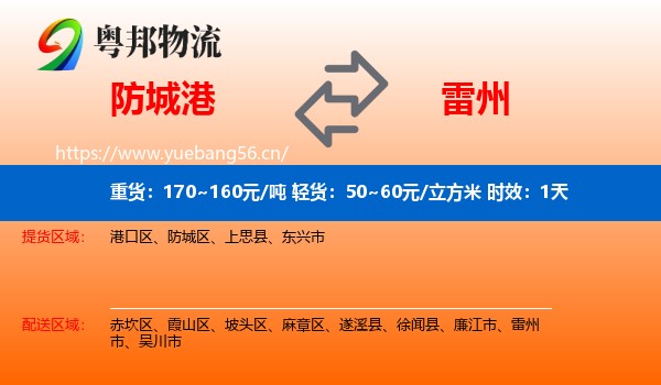 防城港-雷州市 | 起步价格 | 重量报价 | 体积报价 | 运输时效 |