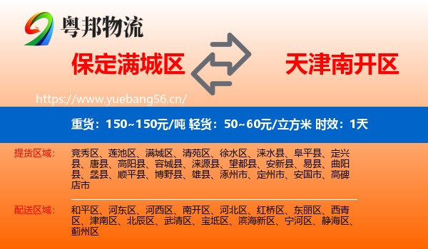 满城区到南开区物流公司专业运营从河北/保定/满城区至天津/南开区货物运输业务,经过多年的运营和发展,满城区到南开区物流专线已成为粤邦物流的优质品牌物流专线之一。保定满城区到天津南开区专线运营里程约207.07公里,货物运输全程GPS定位,由太平洋保险全程保价运输,可提供“门到门”货运服务、天天发车,重货参考价:150~150元/吨、轻货参考价:50~60元/立方米运费价格根据实际货物类型上下浮动3%;预估时效:1~1天,运输时效和天气及交通状况因素略有差异。