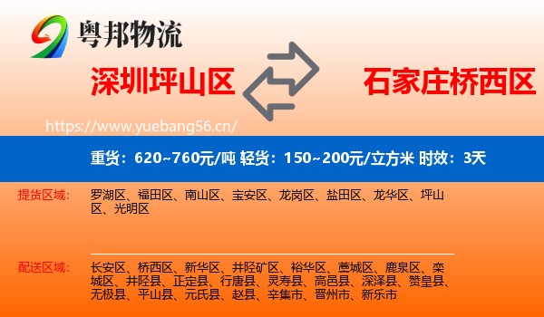 坪山区到桥西区物流公司专业运营从广东/深圳/坪山区至河北/石家庄/桥西区货物运输业务,经过多年的运营和发展,坪山区到桥西区物流专线已成为粤邦物流的优质品牌物流专线之一。深圳坪山区到石家庄桥西区专线运营里程约2214.08公里,货物运输全程GPS定位,由太平洋保险全程保价运输,可提供“门到门”货运服务、天天发车,重货参考价:620~760元/吨、轻货参考价:150~200元/立方米运费价格根据实际货物类型上下浮动3%;预估时效:3~5天,运输时效和天气及交通状况因素略有差异。